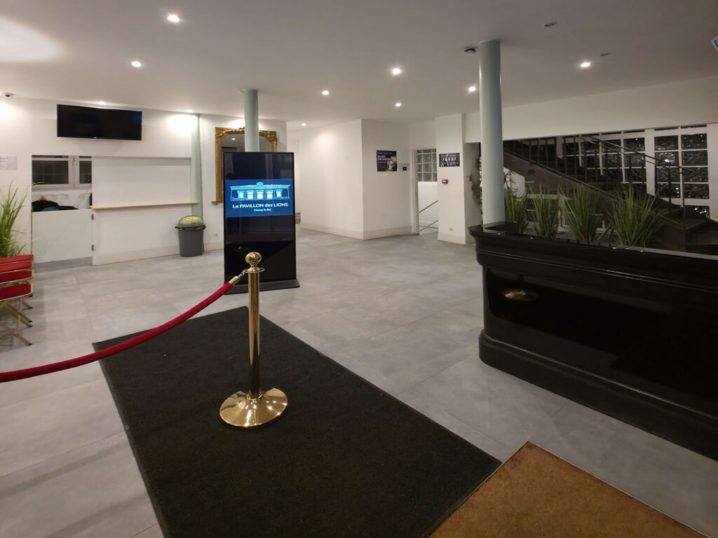 L’espace Accueil du Pavillon des Lions est pensé pour recevoir vos invités dans les meilleures conditions. Il dispose d’un vestiaire pratique, de deux écrans d’affichage pour mettre en valeur vos flyers ou annonces d’événements, ainsi qu’un meuble d’accueil pour orienter et renseigner vos participants. Cet espace convivial complète parfaitement les salles principales et contribue à offrir une expérience fluide et professionnelle dès l’arrivée sur le site.